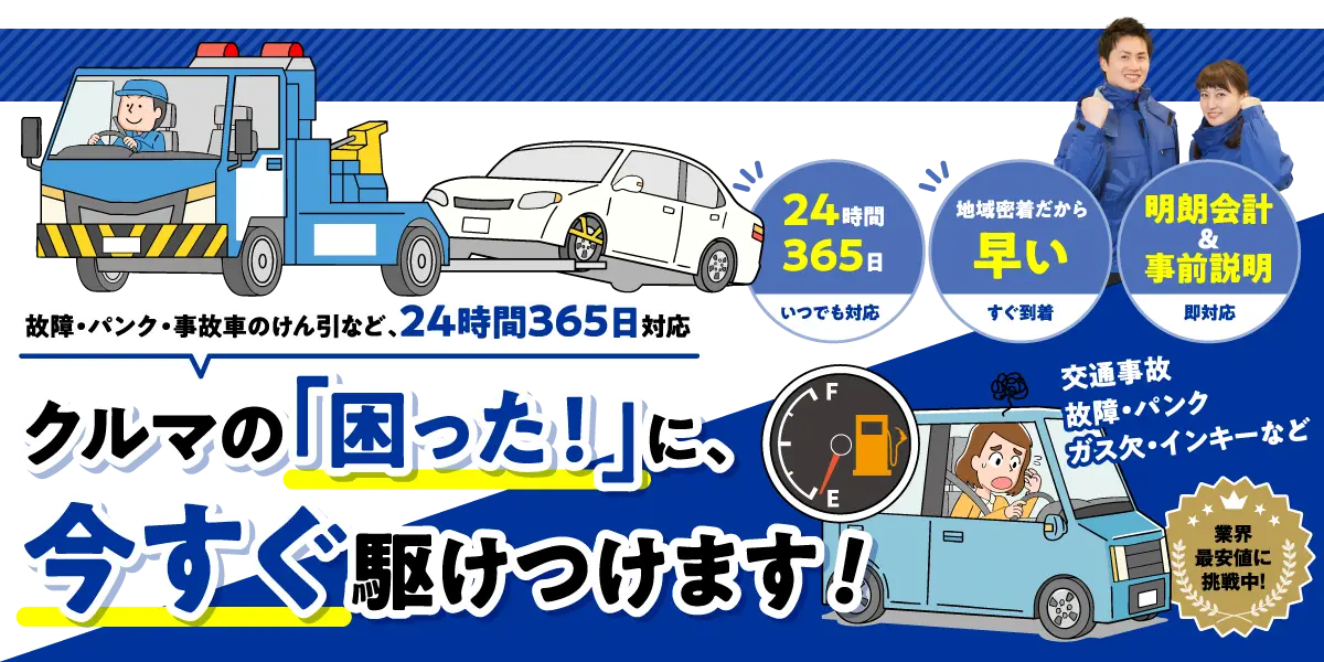 事故・故障・脱輪・パンク・ガス欠など、あらゆる緊急トラブルに迅速・丁寧に対応いたします。